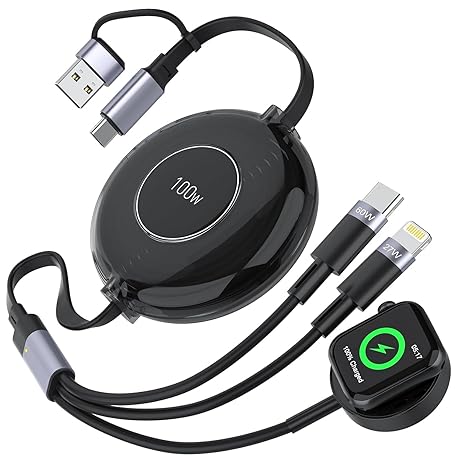 100W Multi Charging Cable for Apple Watch Charger, 6 in 1 Retractable iWatch Charger Cord, 3 in 2 Retractable iPhone 15 and iWatch Fast Charging Cable for Apple Watch Series, Galaxy&iPad, (Black)