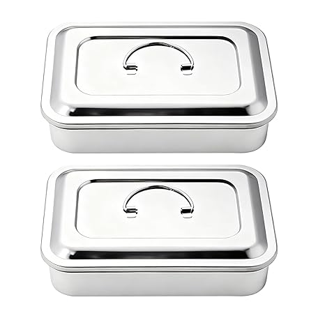 2 Pcs Medical Surgical Trays, Stainless Steel Dental Instruments Tray Organizer Holder, Plate Box with Lid, Large Capacity, Easy to Handle