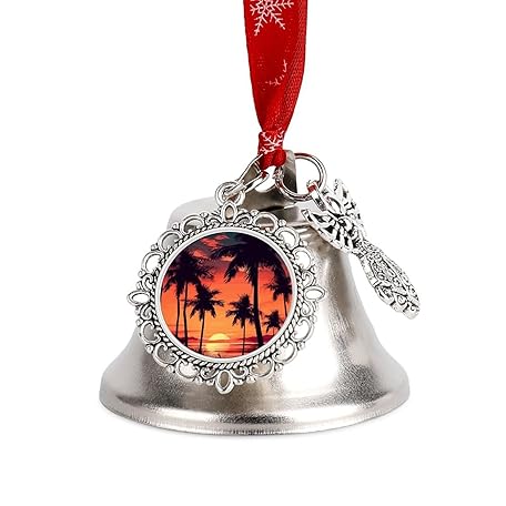 2025 Christmas Jingle Bells, Xmas Bells with with Angel Wing & Round Pendants Hanging Ornament, Silver Palm Tree Summer Sunset Craft Bells for Christmas Tree Wreath Party Holiday Decorations