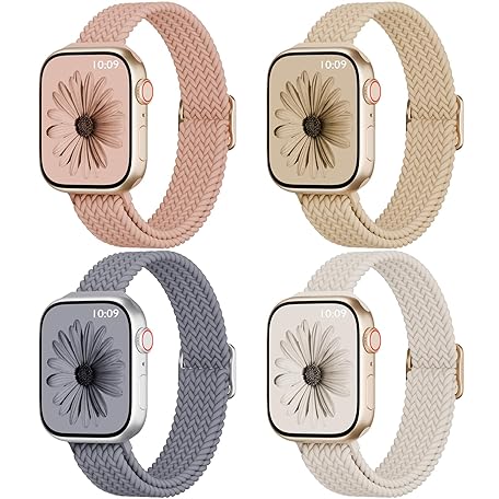 4 Pack Slim Braided Stretchy Compatible with Apple Watch Band 38mm 42mm 40mm 44mm 41mm 45mm 46mm 49mm Women Men, Solo Loop Nylon Thin Strap for iWatch Series 11 10 9 8 7 SE 6 5 4 3 Ultra