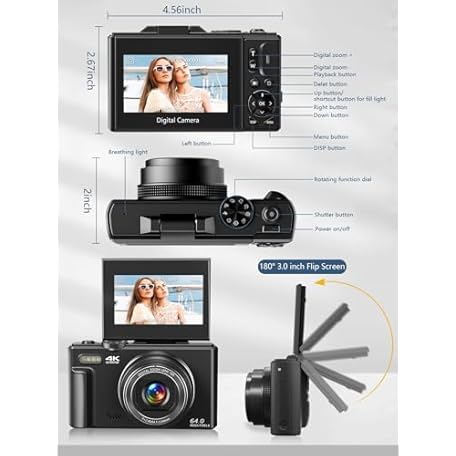 Thông tin sản phẩm 4K Digital Camera for Photography, WiFi 64MP Autofocus Vlogging Camera for YouTube with 3" 180°Flip Screen, 18X Digital Zoom Compact Vlog Travel Camera with 32GB SD Card, Batteries, Black