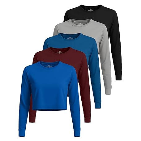 • 5 Pack: Women's Dry Fit Crop Top - Long Sleeve Crew Neck Stretch Athletic Tee (Available in Plus Size), Set 9, XXL