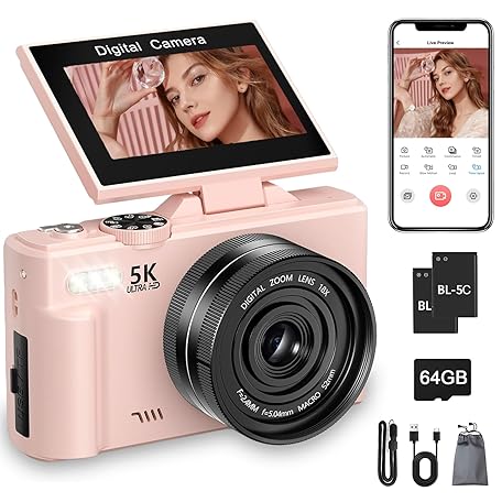 5K Digital Camera, 75MP WiFi Vlogging Camera with 180° Flip Screen, Autofocus, 18X Zoom, 64GB Card, 2 Batteries, Compact Point and Shoot Digital Cameras for Beginner Teens Student Kids Girls (Pink)