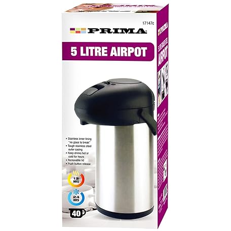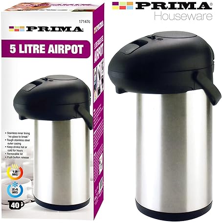 Sản phẩm 5L Prima Professional Stainless Steel AIRPOT HOT & Cold Drinks Tea Coffee Vacuum Flask JUG Energy Saver Pump Action AIR Pot Insulated Carry Handle Travel UK Free P&P đang được bán với giá ưu đãi là $39.4471 tại nước Anh.