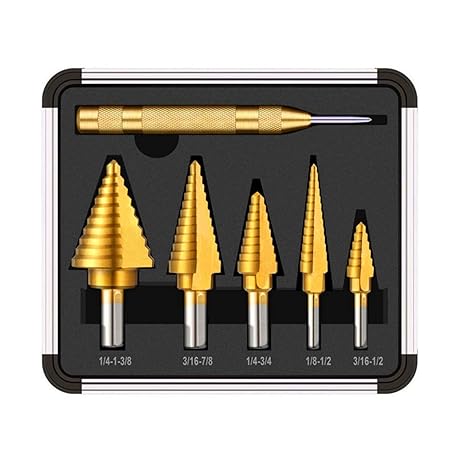 5Pcs Step Drill Bit Set with Automatic Center Punch, HSS Titanium High Speed Steel Step Drill Bits, 50 Sizes Step Bits for Metal, Aluminum, Wood, Plastic