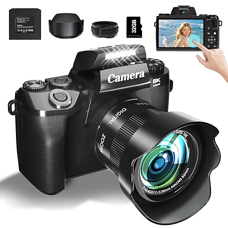 8K Digital Camera for Photography and WiFi & Dual-Lens Vlogging with 4" Touch Screen, 64MP Vlog Cameras 16X Digital Zoom, 3000mAh Battery, 32GB TF Card & Lens Hood(Black)