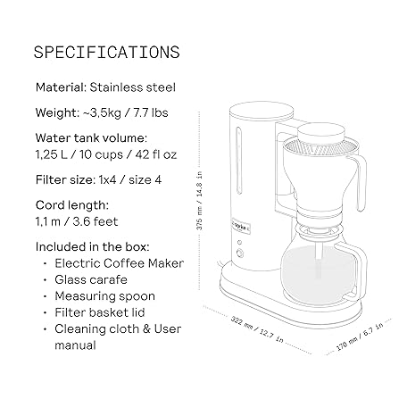 Thông tin sản phẩm aarke Coffee Maker - Electric Drip Filter Coffee Brewer, Stainless Steel, Glass Carafe, Smart Hot Plate, 10 Cup Capacity, 1.25L