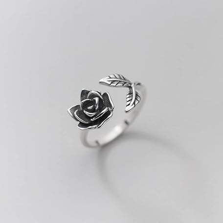 Adjustable Ring For Women - Retro Rose Ring Personality Fashion Cool Black Leaves Open Ring S925 Resizable Ope
