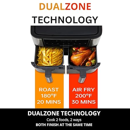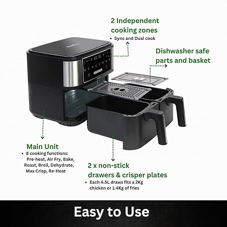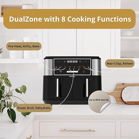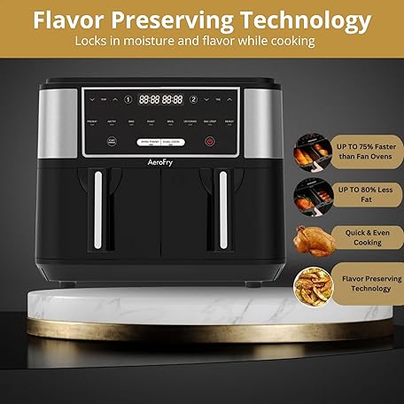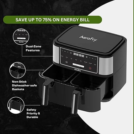 Thông tin sản phẩm AeroFry Air Fryer - 9 Litres, DUAL ZONE Digital Airfryer, Uses No Oil, Max Crisp, Roast, Bake, Reheat, Dehydrate, Cook 8 Portions, Non-Stick Dishwasher Safe Baskets, 2 Years Warranty !!!