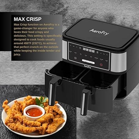 Thương hiệu AeroFry là cái tên nổi tiếng được rất nhiều khách hàng trên thế giới chọn lựa. Với kiểu dáng đẹp mắt, sang trọng, sản phẩm AeroFry Air Fryer - 9 Litres, DUAL ZONE Digital Airfryer, Uses No Oil, Max Crisp, Roast, Bake, Reheat, Dehydrate, Cook 8 Portions, Non-Stick Dishwasher Safe Baskets, 2 Years Warranty !!! là sự lựa chọn hoàn hảo nếu bạn đang tìm mua một món cho riêng mình.
