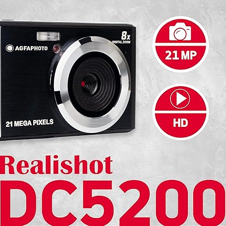 Thông tin sản phẩm AGFA PHOTO Realishot DC5200 - Compact Camera, 21MP, 2.4" LCD Screen, 8x Digital Zoom, 720p HD Video, Lithium Battery, SD Cards, Scene Modes - Black