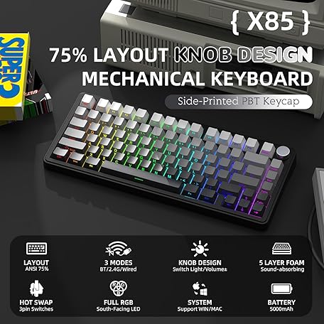Thông tin sản phẩm AJAZZ x ATTACK SHARK X85 Gasket Mechanical Keyboard,75% Wireless Gaming Keyboard with Knob,5-Layer Padding,PBT Side-Printed Keycap,BT5.1/2.4Ghz/USB-C Wired,Hot-Swap Linear Switch,RGB,NKRO,for PC,MAC