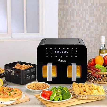 Alivio 9L Double Basket Air Fryer 2400W, Visual Window Adjustable Temperature, Healthy Cooking Large Dual Basket Family Size Air Fryer (Black)