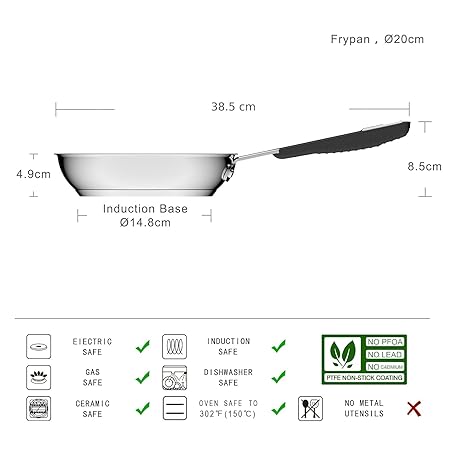 Thông tin sản phẩm Amazon Basics Stainless steel frying pan with non-stick coating, suitable for induction cookers, with comfortable handle, 20 cm, Silver