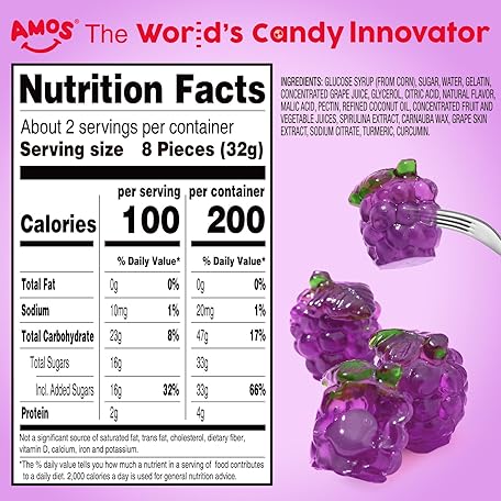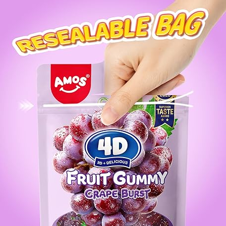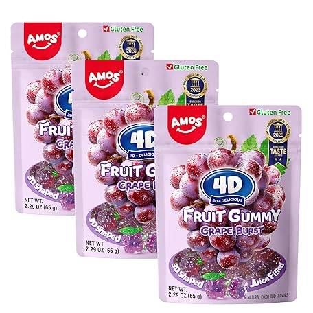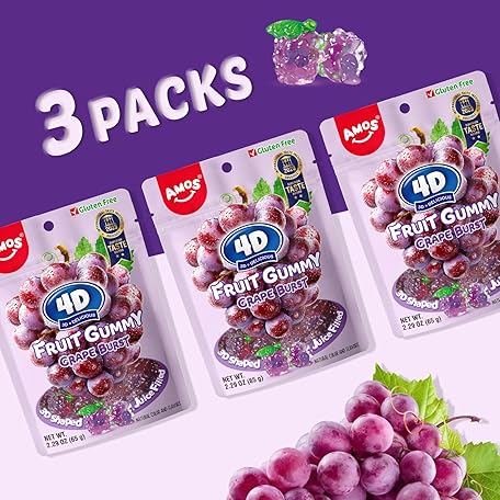 Thông tin sản phẩm Amos 4D Gummy Sweets Fruit Gummy Grape Burst, Jelly-Filled Grape Candy, Natural Flavor - Resealable 2.29oz Bag (Pack of 3)