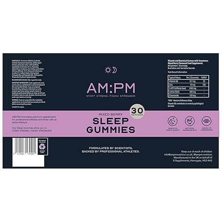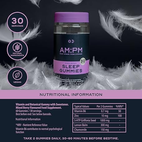 Thông tin sản phẩm AM:PM Sleep Gummies - Vegan Sleep Aid with Natural Ingredients - Lemon Balm, Chamomile, Zinc, Vitamin B6 & 5-HTP - Berry Flavour - 60 Gummies (30 Day Supply)
