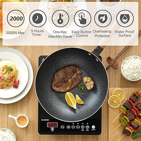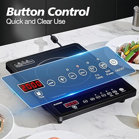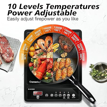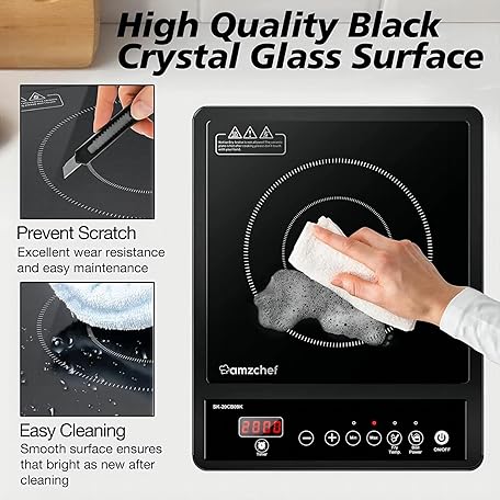 Thông tin sản phẩm AMZCHEF Single Induction Hob, Portable Induction Hob, 10 Temperature Settings and Power levels from 300W to 2000W, Black Frosted Glass Panel,Sensitive Press Control, 3-hour Timer