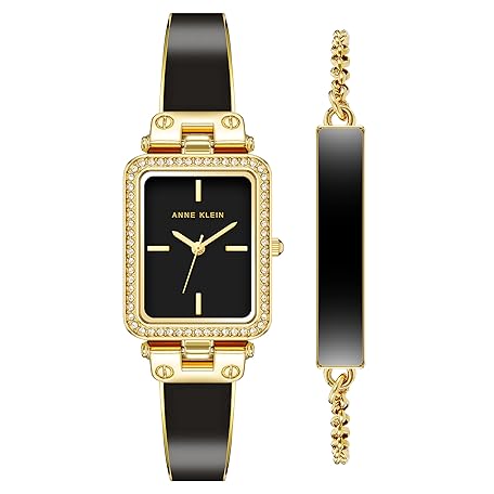 Anne Klein Women's Premium Crystal Accented Bangle Watch and Bracelet Set, AK/3898, Black/Gold, Black/Gold