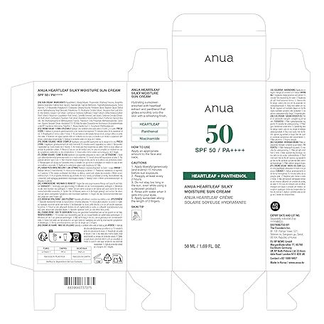 Thông tin sản phẩm ANUA Heartleaf Silky Moisture Sun Cream SPF 50 PA++++, Korean Sunscreen for Face, Korean Skincare, Korean Makeup Base, Niacinamide, Fragrance Free, Travel Essentials, No White Cast, 50ml /1.69fl.oz