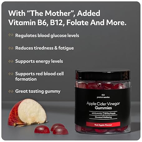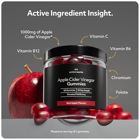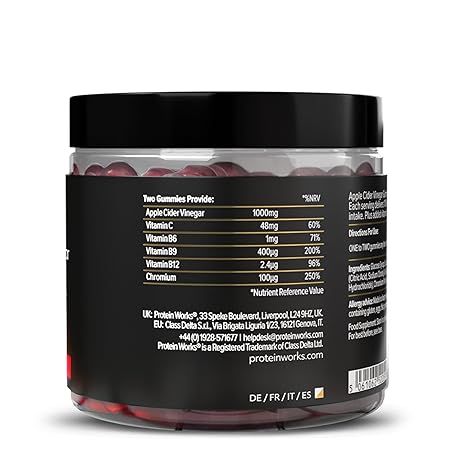 Thông tin sản phẩm Apple Cider Vinegar Gummies, 1000mg with The Mother, Enhanced with Vitamins B6, B9, B12 & C Plus Chromium, Natural Ingredients, Red Apple Flavour, 60 Gummies - Protein Works