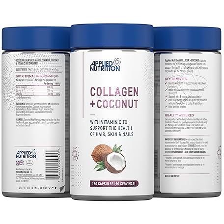 Thông tin sản phẩm Applied Nutrition Collagen + Coconut Capsules – Marine Collagen with Vitamin C & Coconut Oil – Hair,Skin & Nails Support – Joint & Connective Tissue Health –Halal Certified –180 Capsules (90 Servings)