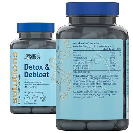 Thông tin sản phẩm Applied Nutrition - Solutions - Detox & Debloat - Vegan Capsules with Activated Charcoal, Milk Thistle & Dandelion Root Extract – Reduces Bloating & Supports Liver Health (60 Capsules – 30 Servings)