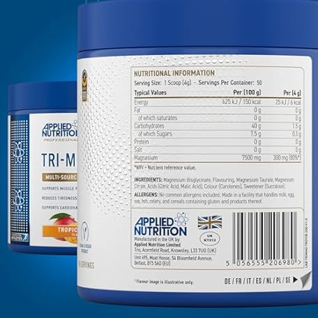 Thông tin sản phẩm Applied Nutrition Tri-Magnesium Powder 3 in 1 - Magnesium Glycinate Supplements for Bone, Muscle, Nervous System Sleep Health - 300 mg per Serving (200g - 50 Servings) (Tropical Vibes)