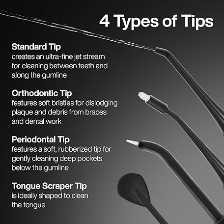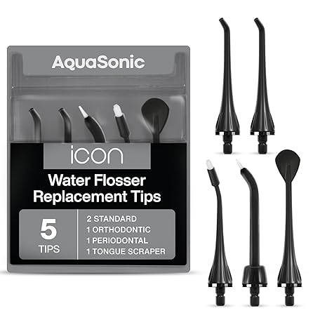 Thông tin sản phẩm AquaSonic Icon Water Flosser Replacement Tips – 5 Tips, 4 Tip Types: Standard, Periodontal, Orthodontic & Tongue Scraper - Genuine, Authentic Parts (Onyx)