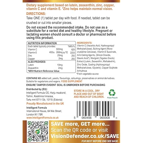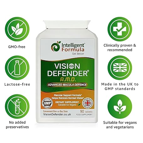 Thông tin sản phẩm AREDS2 VISION DEFENDER AMD Supplement: Lutein, Zeaxanthin, Zinc, Vitamin E – AREDS 2 Eye Vitamins, Minerals, Nutrients for Eyes. 3 Months Supply (90 tablets) One-A-Day Vegan Eye Supplement. Made in UK