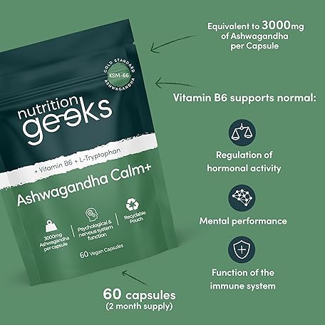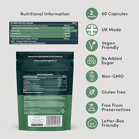 Thương hiệu Nutrition Geeks là cái tên nổi tiếng được rất nhiều khách hàng trên thế giới chọn lựa. Với kiểu dáng đẹp mắt, sang trọng, sản phẩm Ashwagandha KSM 66 Complex – 3000mg Enhanced with L-Tryptophan & Vitamin B6 (2 Month Supply) – Ashwagandha High Strength Capsules with 250mg Extract (Not Gummies or Powder) - Vegan, UK Made là sự lựa chọn hoàn hảo nếu bạn đang tìm mua một món cho riêng mình.