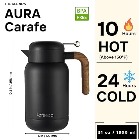Aura Thermal Coffee Carafe - Vacuum Insulated Stainless Steel Tea Pot & Water Pitcher, Keeps Drinks Hot or Cold, BPA-Free, Beverage Dispenser Thermos - 51 oz Black