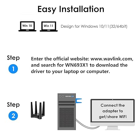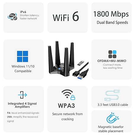 Thông tin sản phẩm AX1800 USB WiFi Dongle, WAVLINK WiFi 6 Dongle with Dual Band 5GHz+2.4GHz, OFDMA, WPA3, MU-MIMO, 4x3dBi High Gain Antennas, USB WiFi Adapter for PC Desktop, for Windows 11/10 ONLY, Magnetic Base Design