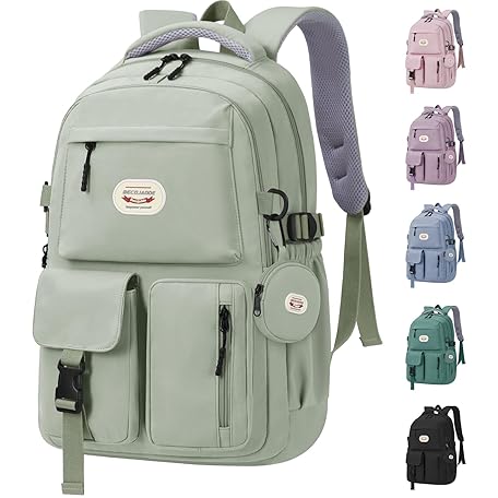 Backpack School Bag Womens Girls with 15.6'' Laptop compartment, Water Resistant Rucksack with Coin Purse, Daypack for College, Work & Travel, Ideal for Teens & Students Green 25L