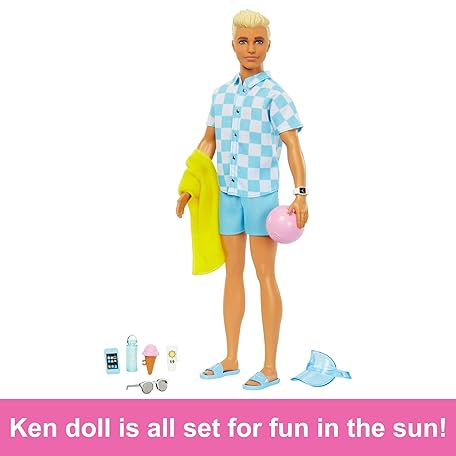 Sản phẩm Barbie - Blonde Ken Doll with Blue Button Down and Swim Trunks, Visor, Towel and Beach-Themed Accessories, HPL74 đang được bán với giá ưu đãi là $37.8012 tại nước Anh.