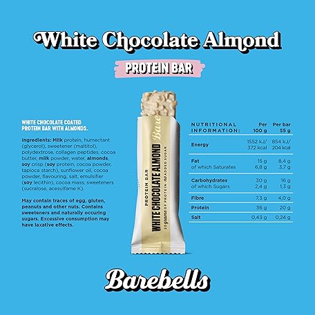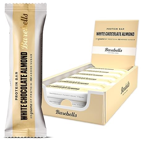 Thông tin sản phẩm BAREBELLS Protein Bars – Healthy Snacks, Protein Snacks for Breakfast, Sugar Free Chocolate, Low Carb – 12 x 55g (White Chocolate Almond)