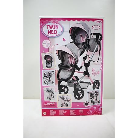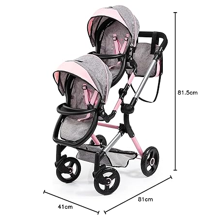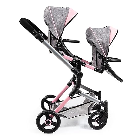 Thông tin sản phẩm Bayer Design 26233AA Dolls Twin Pram, carriage, adjustable handle, foldable, bag, integrated shopping basket, Grey, Pink With Butterfly, Jean Look