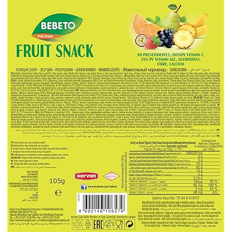 Thông tin sản phẩm Bebeto Fruit Snacks (105g), Real Fruit Juice + No Artificial Colours or Flavours + Halal Certified Sweets, Each Pack Contains 7 x mini 15g bags, Total Single Pack, 105g