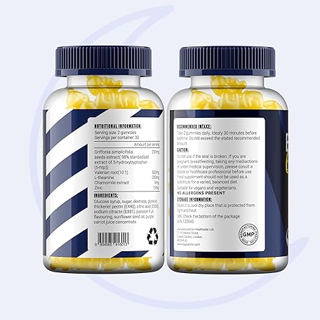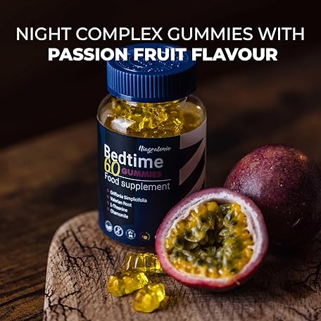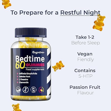 • Bedtime Gummies with Griffonia Seed Extract, 5-HTP 60 Gummies Vegan, Gluten-Free, Passion Fruit Flavour, Valerian Root, Chamomile, L-Theanine, Melatonin Free Food Supplement