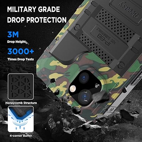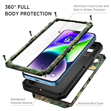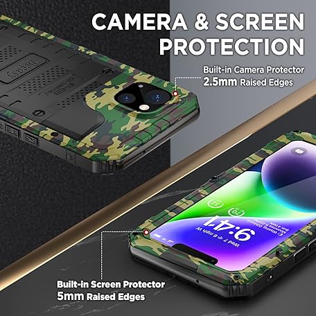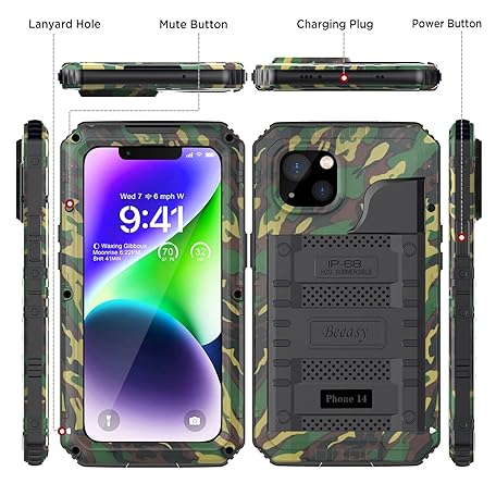 Beeasy for iPhone 14 Case Waterproof Heavy Duty Shockproof Tough Metal Armour Cover Dustproof Built-in Screen Protector, Robust 360 Full Body Military Protective Rugged Case for iPhone 14 Camo