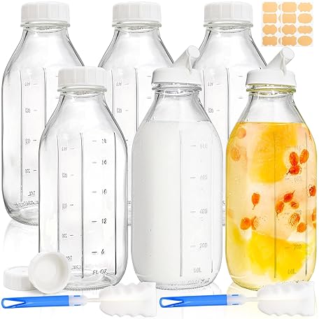 Bekith 6 Pack Liter Glass Milk Bottles with Airtight Screw Lid, 32 Oz Reusable Glass Bottles with Dispenser Cap for Milk, Honey, Jam, Syrup (2 Pour Spout Lids, 2 Lables and 2 Bottle Brushes Included)