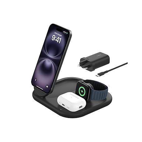 Thông tin sản phẩm Belkin BoostCharge 3-in-1 Magnetic Foldable Charger with Qi2 15W, MagSafe Compatible Fast Charger for iPhone 17, Air, 16, Pixelsnap, Apple Watch, AirPods with Non-Slip Base, PSU Included - Black