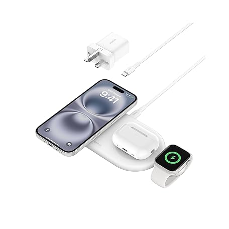 Belkin BoostCharge Pro 3-in-1 Wireless Charging Pad with Magnetic Qi2 15W, Fast Charging iPhone Wireless Charger Compatible with iPhone 16 Series, AirPods, Apple Watch & More - White