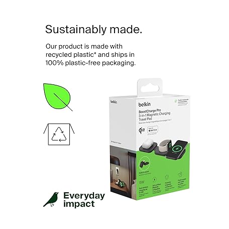 Thông tin sản phẩm Belkin BoostCharge Pro Foldable Qi2-Certified Wireless Charger 3-in-1 Magnetic Charging Travel Pad 15W - MagSafe-Compatible Portable Charger for iPhone 17, Air, 16, Pixelsnap, Apple Watch 11, AirPods