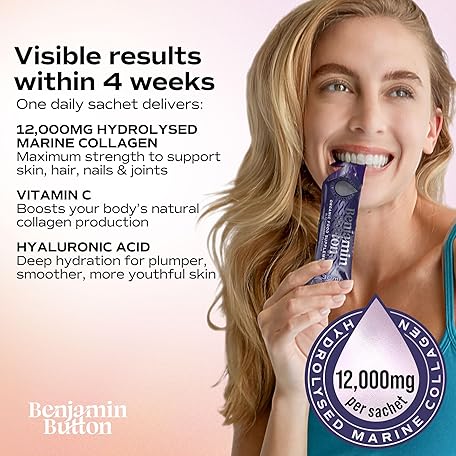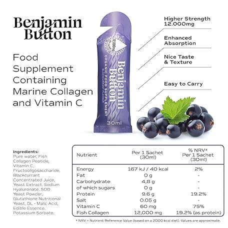Thông tin sản phẩm Benjamin Button Marine Collagen Liquid Sachet w/Hyaluronic Acid & Vitamin C | for Hair, Skin, Nails & Joints | 12,000mg High Strength Hydrolysed Collagen (Blackcurrant, 14x Sachets)