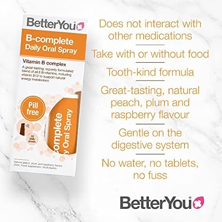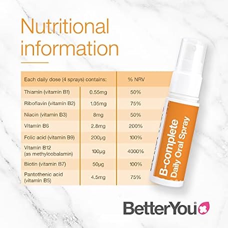 Thông tin sản phẩm BetterYou B-Complete Daily Oral Spray, Pill-Free Vitamin B Complex Supplement, Formulated Blend of All 8 B Vitamins, Including B12 to Support Natural Energy, 1-Month Supply, Made in The UK (Pack of 2)