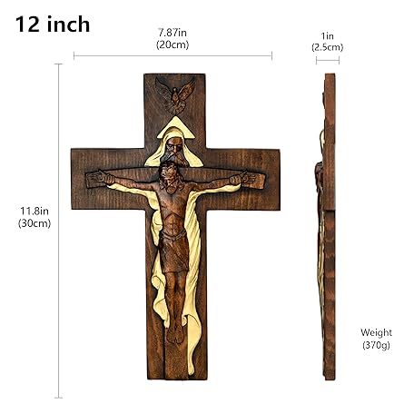 Thông tin sản phẩm BGCOPPER Holy Trinity Crucifix Wall Cross, Christ Jesus Cross for Wall with Hook, Handmade Wooden Cross Wall Decor for Home Room Church Christmas Gifts (Gold, 12 Inch)