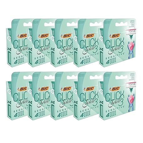 BIC Click 3 Soleil Sensitive Womens Razor Refill 4 Cartridges Plastic Razor Refill with 3 Blades Lubricating Strip with Aloe Vera and Vitamin E Razor Refills for Smooth Shave (Pack of 10)