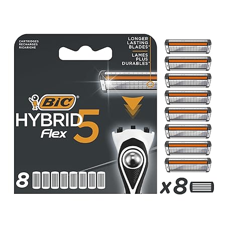 Bic Hybrid 5 Flex Men's Razor Refills with 5 Moveable Nano-Tech Titanium Blades - Box of 8 Cartridges, Black/White