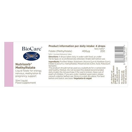 Thông tin sản phẩm BioCare Nutrisorb Methylfolate | High Potency Liquid Folate | Immunity, Energy, Methylation & Pregnancy Support - 15ml