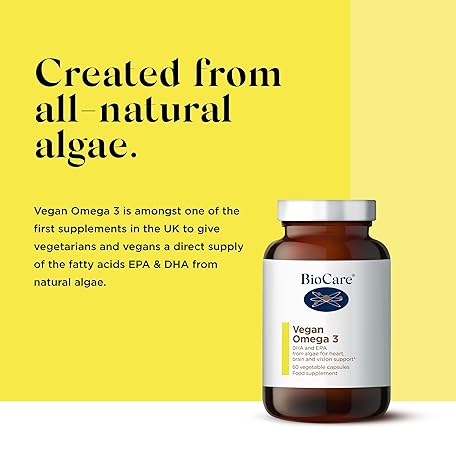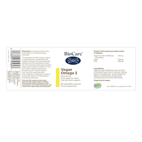 Sản phẩm BioCare Vegan Omega-3 | Vegetable Capsules | DHA and EPA from Algae for Heart, Brain and Vision Support | Food Supplement | Suitable for Vegetarians and Vegans | 60 Capsules đang được bán với giá ưu đãi là $43.5455 tại nước Anh.